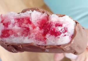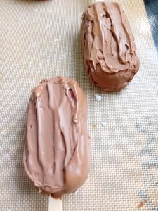 5. Take the lolly out of the freezer and the mould, and dunk it into the chocolate. I didn’t have enough chocolate to do that and so ladled it on with a spoon. It sets straight away.