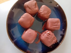 Once set I put them in a bag in the freezer. Some I had dipped in melted chocolate, some I hadn’t. A good way to use up over ripe bananas in the summer.
