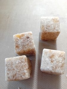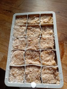 As usual, I am trying to save on waste and had some over ripe bananas to use up. I therefore mashed 4 bananas up in a bowl, and added 3.5 ounzes of desicated coconut, and mixed. I popped these into silicone ice cube trays and froze over night.