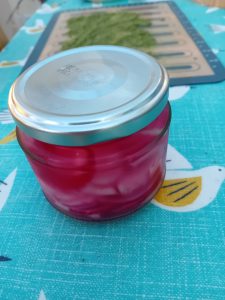 1. I had some brine in a bottle in my fridge. It was left over from making cucumber fridge pickles the other day. Whilst watering my garden I had found two small, red onions with the stalks turned over. They hadn’t grown very well. I had put them in a spot that nothing seems to grow in as it is shaded, and near a tree. They were therefore pulled up.