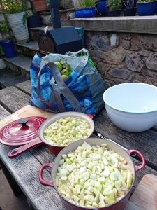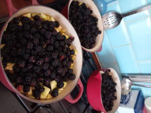 We have a massive bag of foraged apples to process, and we went blackberry picking today. I managed to squeeze one bag of blackberries into the freezer, but had lots left. Water bathing  blackberry and apple compote seems the sensible solution until I can make more room in my freezer. I don’t want to miss the blackberry season.