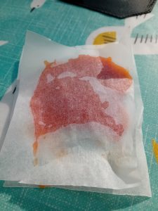 5. The puree looked ready when I came in and so I cut up some squares of grease proof paper. I put a tablespoon of puree on a square and then put a square of greaseproof on top. Next I put another tablespoon of puree on this paper and placed another square on top. I repeated this 7 times until the puree had gone. A square of greaseproof paper was placed on top.