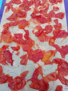 2. When I came back they were soft and so I took the skins off the tomatoes. I placed them on a silicone mat to dehydrate in my warm conservatory. They just fell off the fruit easily. A dehydrator or an air fryer could be used to dehydrate them but I am saving energy.. Once dry I will grind them into a tomato powder which I will add to soups during the winter.
