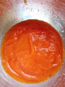 4. The next step was to whiz what was left of the tomato with a hand blender. the tomato. Next I placed it in a pan, and simmered it down for 10 minutes. It needed to cook a bit longer to reduce down and so I placed it on a silicone mat in the sun in my conservatory. I needed to get a few jobs done before it rained, but I could have cooked it longer to reduce the liquid.
