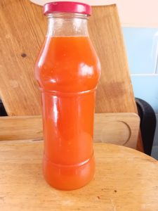 3. I then drained the juice from the tomatoes through a sieve and placed it in a sterile bottle. This went into the fridge when cool. I will make a rissotto with this, and drink some. It tastes gorgeous and sweet.