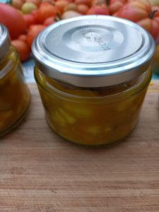 Tomatoes are turned into jars of passatta and tomato puree. I also freeze a few to throw in stews. Enough passatta is made to have 2 or 3 jars a month. Fresh tomatoes are used to make meals for some months of the year. Each year, I also buy 10 tins of organic tinned tomatoes when they are on offer for £1. They are better quality than the cheap tins and have more tomatoes in than the cheap tins. I don’t have enough storage room or jars to be self-sufficient in tomatoes, though this year I have grown enough. We are eating a lot of tomato based meals at the moment.