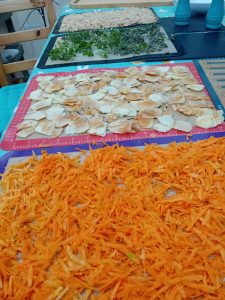 Items are dehydrated to make tea blends, grains winnowed, we make various flavoured salts, essences to flavour baking, and pestos to freeze, For the first time this year we have made crystalised ginger to bake with as it is so expensive, but we love it. Syrups like rosehip have also been made for nutritious sweetening..